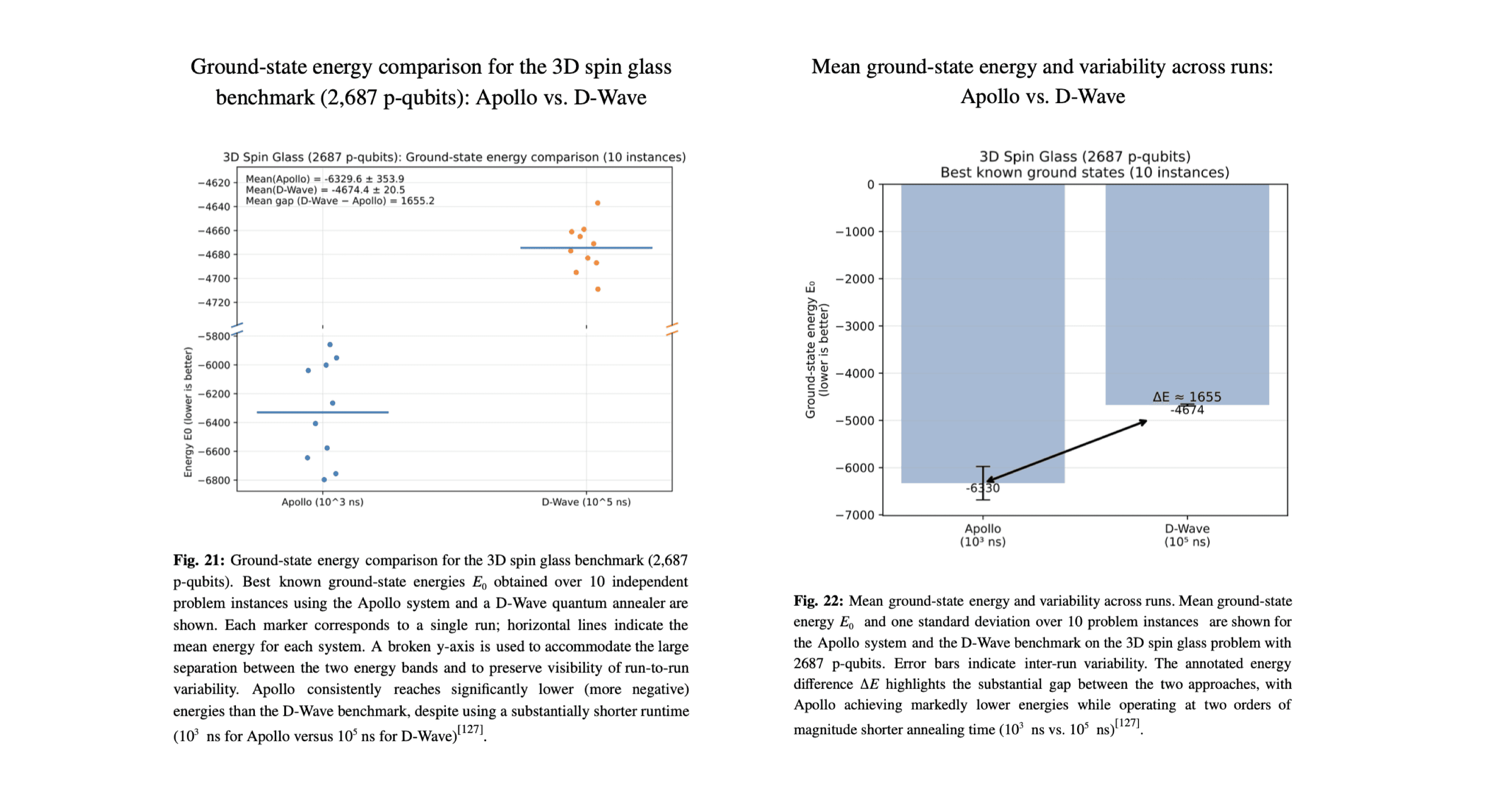 These results demonstrate that Apollo can outperform the best known experimental ground states reported for large-scale programmable spin glasses, even when operating at substantially shorter runtimes. Beyond raw energy quality, this comparison highlights a key practical distinction: Apollo enables exploration of large, densely connected spin systems at scales and efficiencies that are currently inaccessible to other quantum computing architectures. As such, the benchmark in Fig. 21 and Fig. 22 establishes Apollo as a distinct and scalable approach to solving large frustrated optimization problems beyond the reach of existing quantum hardware.