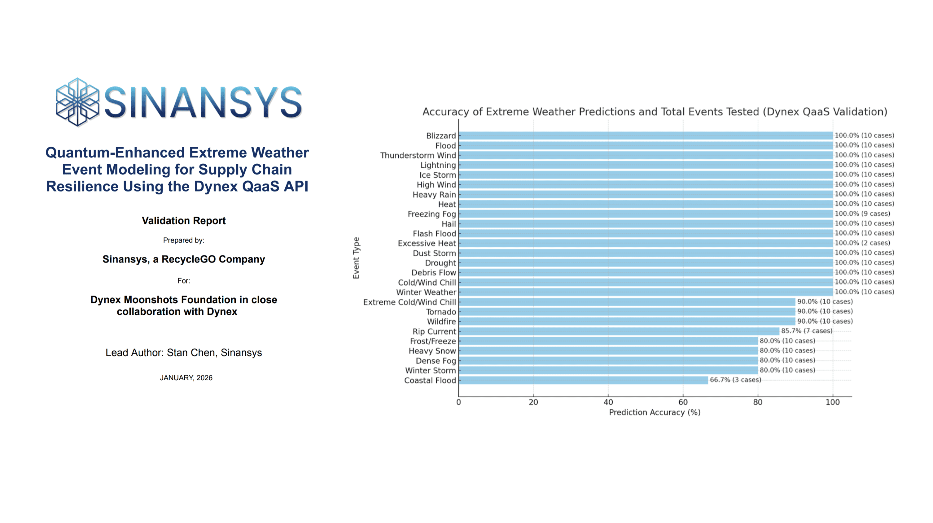 To validate this capability, Sinansys evaluated 241 historical extreme weather events across the United States during 2025, spanning 48 distinct event categories that directly affect supply chains, including floods, winter storms, heat extremes, high winds, and severe precipitation. These events represent the primary drivers of disruption across logistics networks, manufacturing operations, agricultural production, energy infrastructure, and critical assets. Under blind testing conditions and explicit spatiotemporal matching criteria, requiring correct event type, location (±50 km), and timing (±1 day), the Dynex QaaS-enabled framework achieved an overall event-level detection accuracy of 94.61%, while maintaining a low false alarm rate of 2.5%.